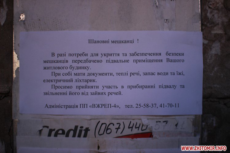 В редакцію Житомир.info звертаються читачі з повідомленнями про те, що біля під’їздів їхніх будинків з’явилися оголошення, підписані адміністрацією ВЖРЕПу, в яких мешканців інформують, що в разі небезпеки укриттям для них слугуватиме підвал.