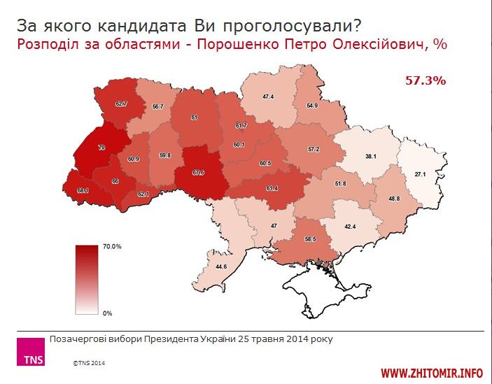 У більшості областей України Петро Порошенко отримав більше 50% голосів виборців, а в одинадцяти областях, в тому числі і в Житомирській області, за нього проголосувало більше 60%. Про це свідчать попередні результати Телевізійного національного екзит-полу, повідомляє ТСН.