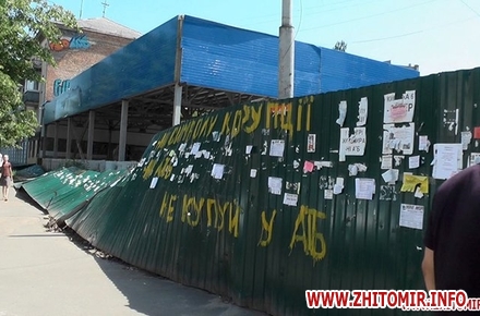 6 червня представник забудовника, який зводить супермаркет «АТБ» у центрі міста, приїхав у Житомир, щоб зустрітися з активістами, які напередодні телефоном поставили йому ультиматум – добровільно демонтувати конструкцію.