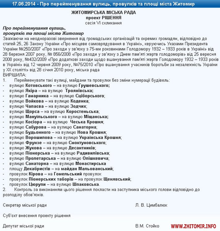 Відповідно до проекту рішення сесії Житомирської міської ради, опублікованому на офіційному сайті мерії, перейменувати планується такі вулиці: