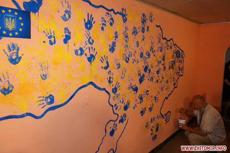 Юрій Камишний створив контур, а всі бажаючі заповнили його яскравими відбитками своїх долонь та фотографіями з різноманітних куточків України.