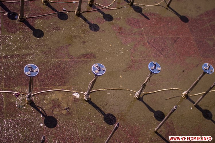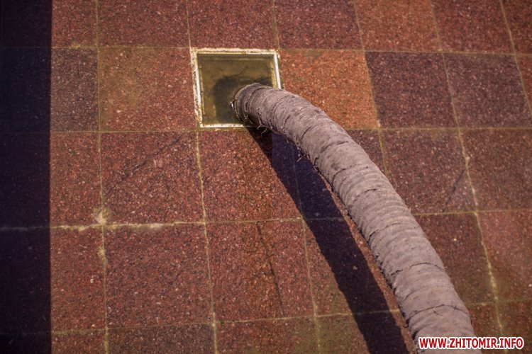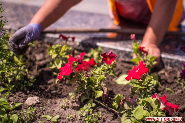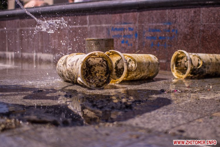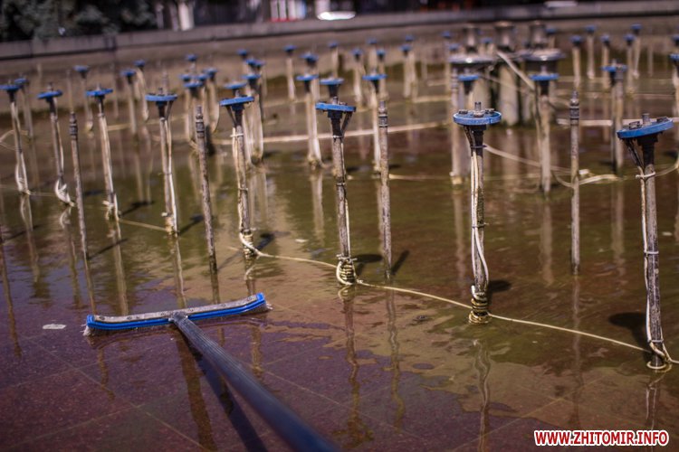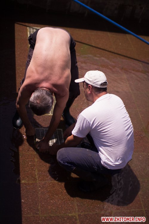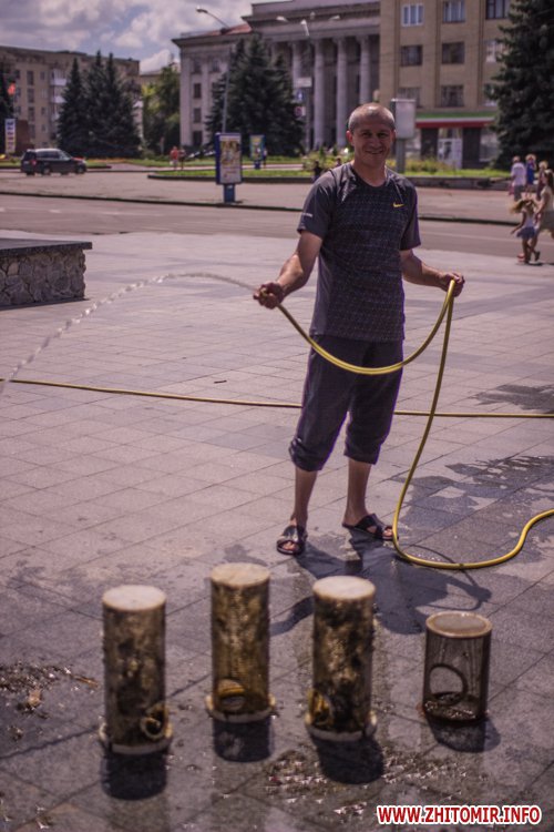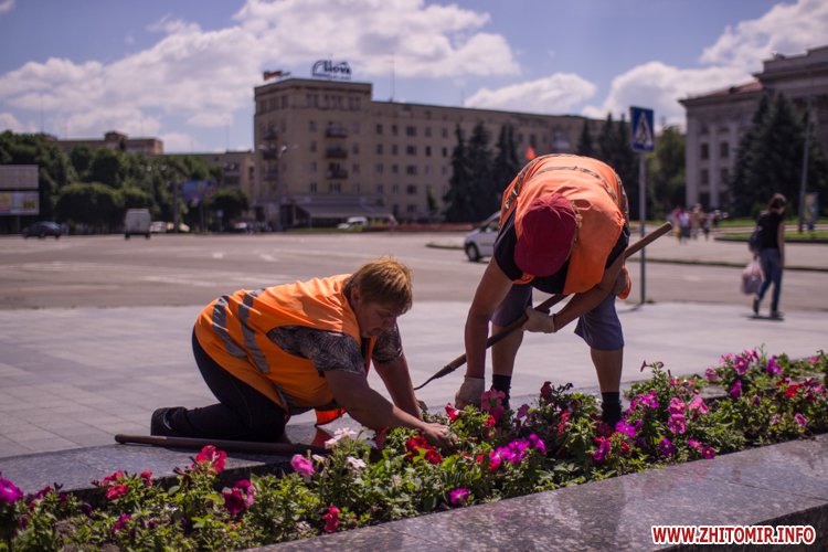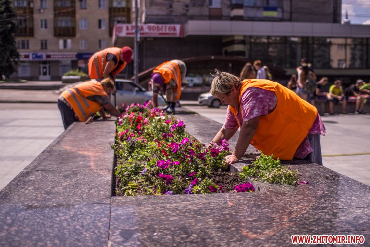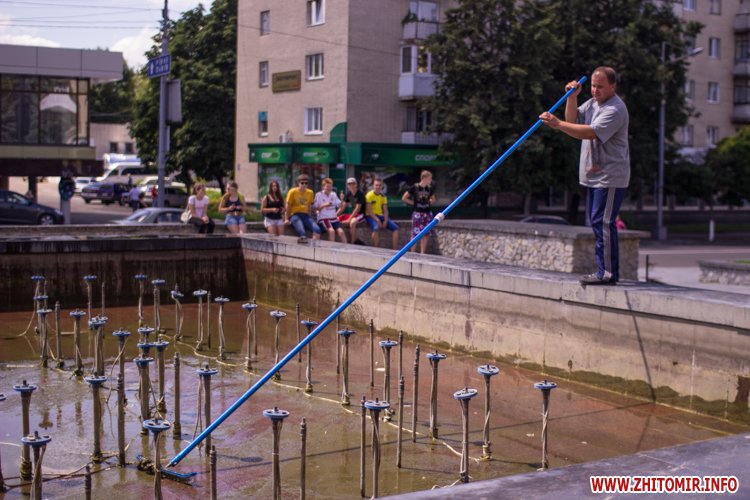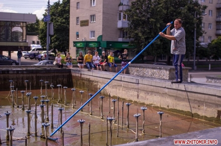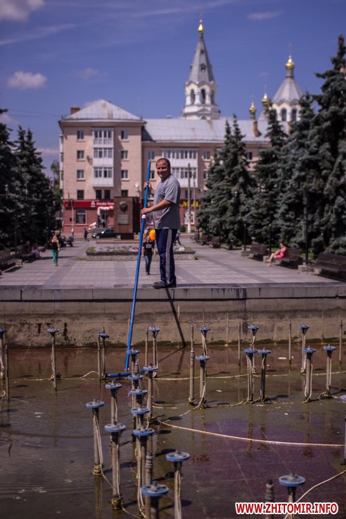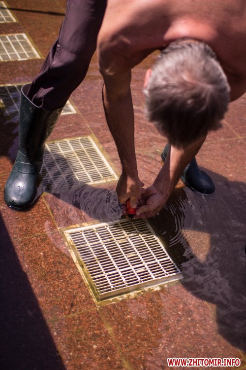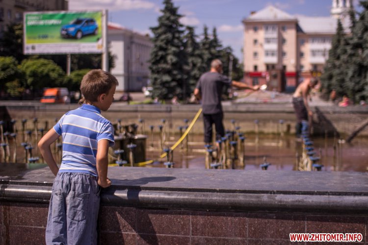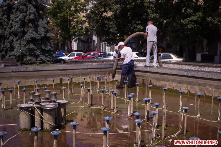 Днем 14 июля в центре Житомира, возле площади Соборной, чистили фонтан и облагораживали клумбы.
