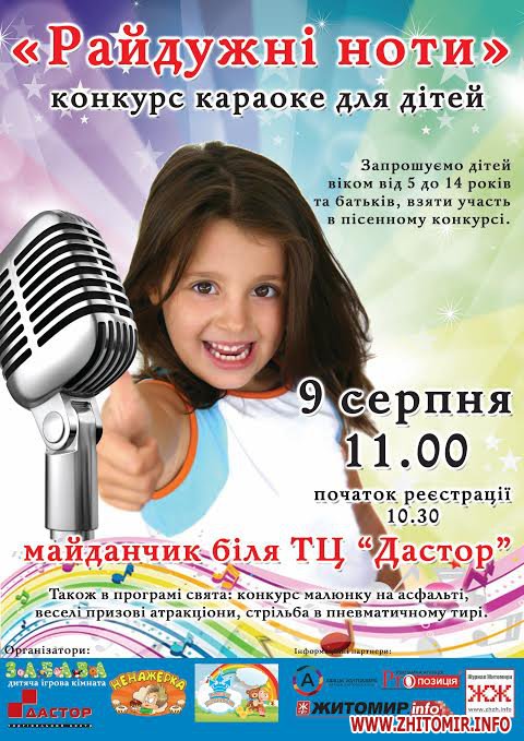 У Житомирі в суботу, 9 серпня, об 11.00 на майданчику біля торговельного центру «Дастор» (перехрестя вулиць Перемоги і Домбровського) відбудеться пісенний конкурс дитячого караоке «Райдужні ноти».