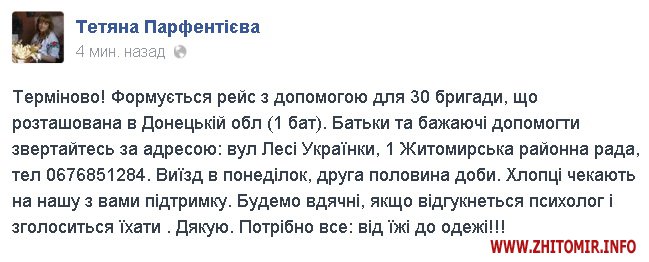 «Терміново! Формується рейс з допомогою для 30 бригади, що розташована в Донецькій обл. (1 бат.). Батьки та бажаючі допомогти звертайтесь за адресою: вул. Лесі Українки, 1 Житомирська районна рада, тел. 0676851284. Виїзд в понеділок, друга половина доби. Хлопці чекають на нашу з вами підтримку. Будемо вдячні, якщо відгукнеться психолог і зголоситься їхати. Дякую. Потрібно все: від їжі до одежі!!!», - написала Парфентієва.