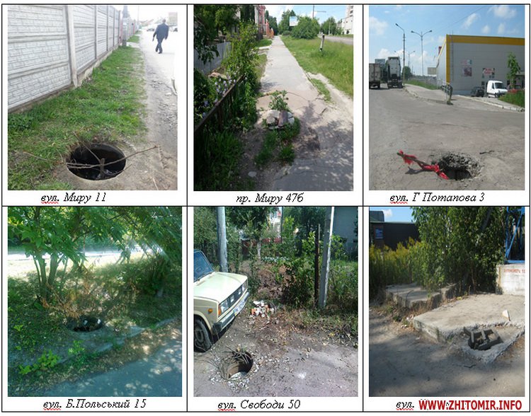 - підприємства, які мають на балансі підземні інженерні мережі, не контролюють стан кришок люків оглядових та приймальних колодязів та несвоєчасно проводять роботу по їх відновленню (ПАТ «Укртелеком», КП «Житомирводоканал», КП «Експлуатація штучних споруд»):