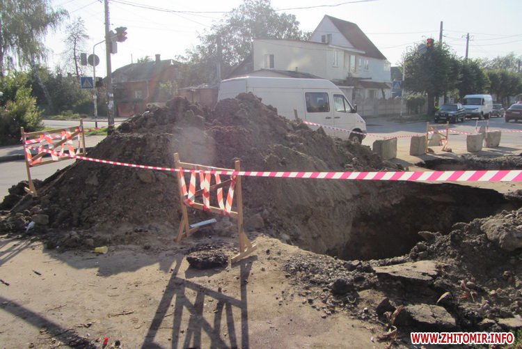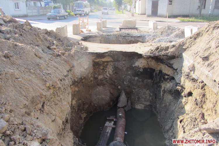 У Житомирі на перехресті вулиць Шелушкова і Гоголівська вже вдруге за останній місяць ремонтують водогін: 4-5 серпня через ремонт людям перекрили воду, а 6 вересня там проводилася перекладка 15 метрів труби.