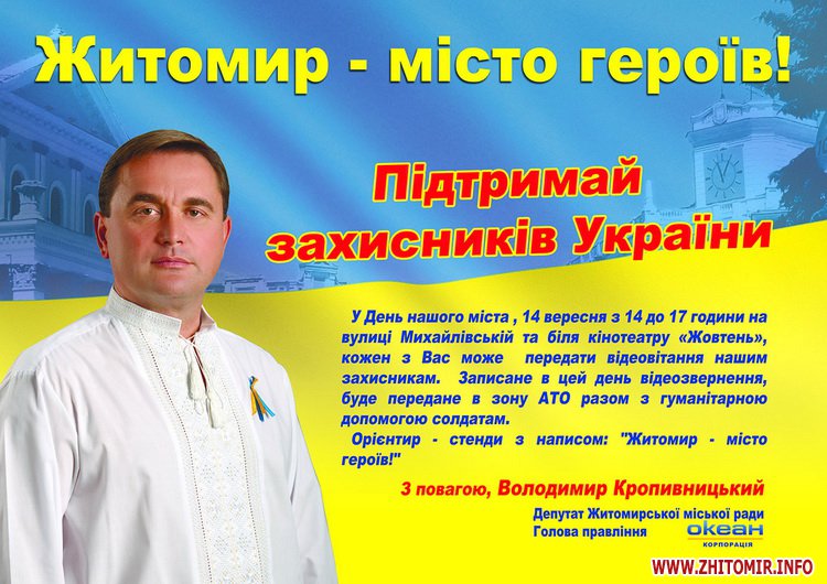 «Ми допомагаємо хлопцям, які несуть службу на Сході. Доставляємо обладнання, продукти, медикаменти, воду. Але вони потребують не лише допомоги речами та продуктами харчування. Їм не вистачає моральної підтримки. На жаль, цього року День міста – не таке радісне свято, як завжди. Наше підприємство у минулі роки також активно залучалось до проведення різних заходів у рамках святкування. Цього року, коли йде війна, не до свята. Ми вирішили зробити цей захід саме на День міста ще й для того, щоб підняти бойовий дух житомирян. Тому запрошуємо житомирян та гостей Житомира долучитись до підтримки наших героїв», - прокоментував мету заходу Володимир Кропивницький.