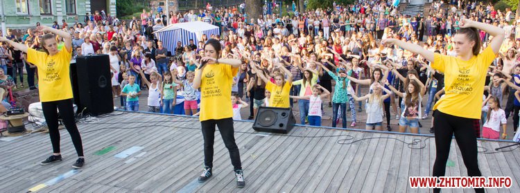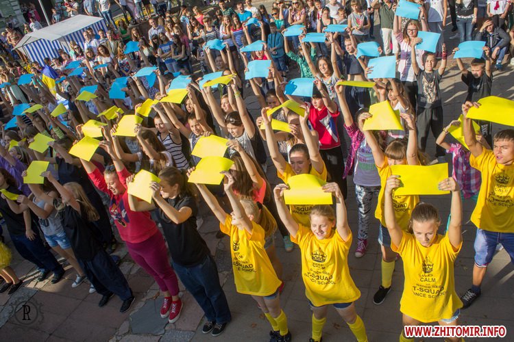 Програму продовжив патріотичний флеш-моб «Живий прапор України – символ миру», який провели лідери відомої житомирської команди «T-Squad» - численні бажаючі взяти в ньому участь власноруч створили біля сцени «живий» прапор, а кожен учасник відчув себе частинкою головного символу України.