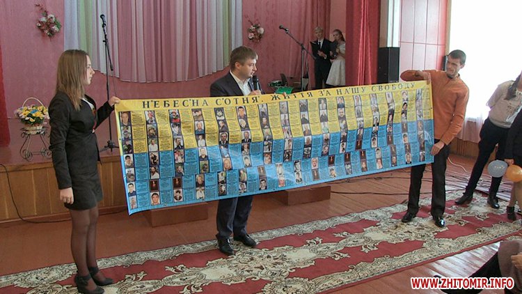 Оплесками гостя зустріли нинішні старшокласники. Сидір Кізін прийшов не з порожніми руками: навчальному закладу він передав стенд з фотографіями героїв Небесної Сотні, бібліотеці подарував книги на історичну тематику, а директору гімназії – планшет.