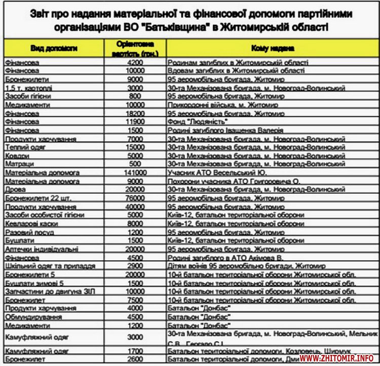 З квітня 2014 року Житомирською обласною партійною організацією, депутатами місцевих рад фракцій «Батьківщина» та окремими членами партії постійно надається та ініціюється різнопланова допомога учасникам АТО та їх сім’ям. За ці місяці члени партії зібрали більше 2 мільйонів гривень. Повідомляє прес-служба Житомирської обласної партійної організації. В містах і районах області проводиться щотижневий збір коштів членами нашої партії разом з місцевими органами влади.