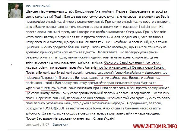 На підтвердження цих тезисів прес-служба подає висловлювання Івана Камінського, розміщеного «В Контакте», де він згадує і про жителів села Михайлівка. Процитуємо «понтового модератора», до батьків якого він звертався з погрозами. «Я знаю, де Ви проживаєте і чим займаєтесь», - пише Іван Камінський і при цьому радить читати Маркса, Енгельса і Гітлера. Варто зазначити, що з вуст демократа Камінського, як він себе називає, цитування Гітлера виглядає дещо екзотичним.