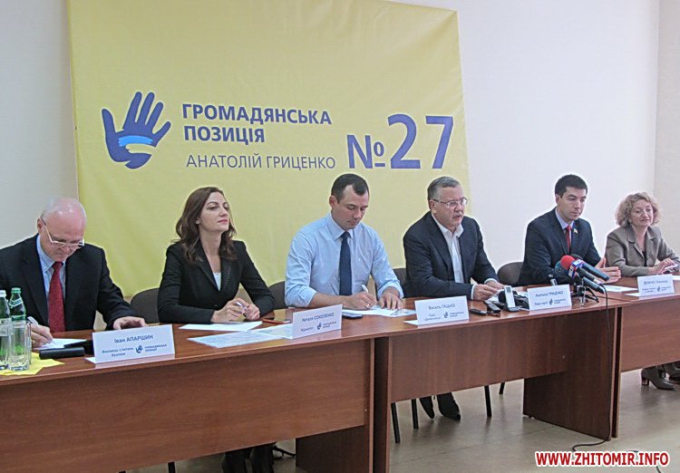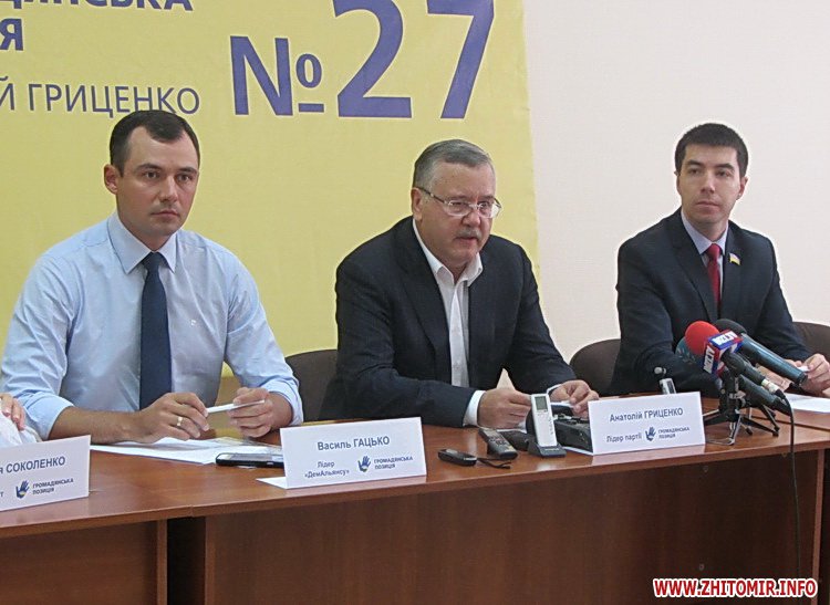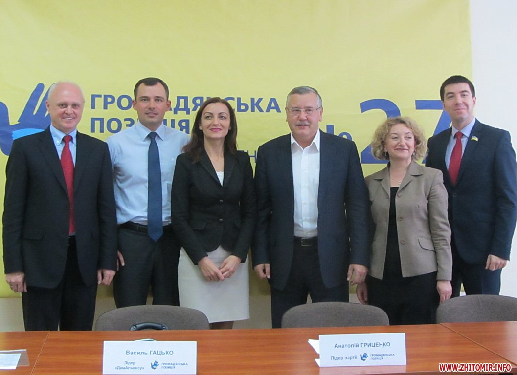 8 жовтня у Житомирі лідер партії «Громадянська позиція» Анатолій Гриценко представив свою команду, з якою йде на вибори до Верховної Ради, та розповів про основні аспекти своєї програми, а саме про безпеку країни та оновлення влади.