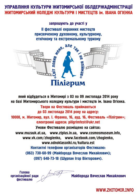 З 3 по 9 листопада 2014 року у Житомирі на базі коледжу культури і мистецтв імені Івана Огієнка пройде Другий фестиваль екранних мистецтв «Пілігрим».
