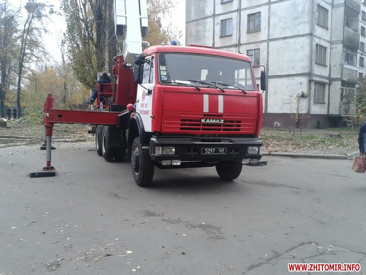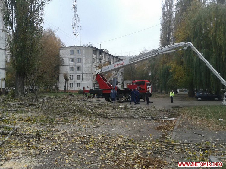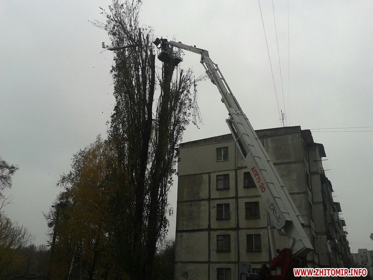 17 октября на Полевой в Житомире срезали высокие тополя, для этого использовали пожарную автовышку. Во время работ рабочие повредили провода, оставив жилые дома и несколько предприятий без связи и интернета.