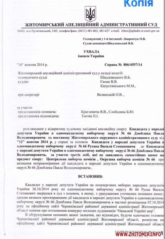 «Визнати протиправними дії кандидата у народні депутати по округу №66 Дзюблика Павла Володимировича в частині розміщення 06.10.2014 року на офіційному веб-сайті Черняхівської РДА Житомирської області новини про оголошення конкурсу молодих художників «Намалюй Україні мир!», - йдеться у постанові суду.