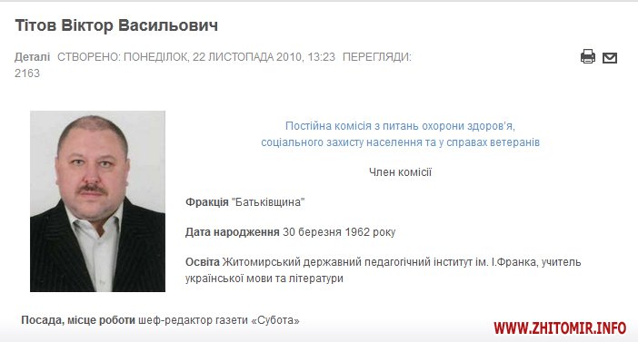 Напомним, Виктор Титов является депутатом Житомирского областного совета (фракция ВО «Батькивщина»).