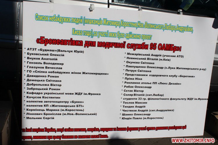 Мікроавтобус був придбаний в рамках проекту «Бронеавтомобіль для медичної служби 95 ОАМБр» за кошти не байдужих житомирян, котрі своїми коштами, енергією, порадами та іншими формами участі суттєво допомагали реалізовувати цей благодійний проект, виявивши при цьому бажання не називати власні імена.