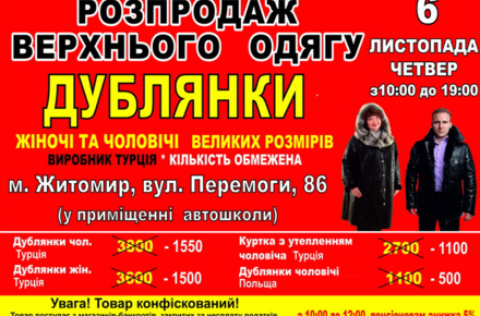У четвер, 6 листопада, в Житомирі відбудеться грандіозний розпродаж верхнього одягу.