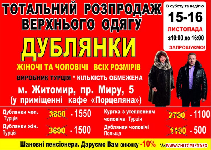 Житомиряни матимуть унікальну нагоду придбати якісні жіночі та чоловічі дублянки і теплі куртки за неймовірно низькими цінами. Є великі розміри. Країна-виробник – Турція, Польща.