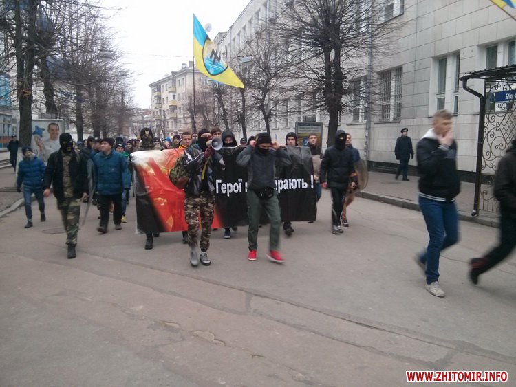 Хода почалася біля будівлі облдержадміністрації. Викрикуючи гасла «Слава Україні!», «Герої не вмирають» та «Москалів на ножі!» люди рушили в бік Соборного майдану, по Київській пройшли до Свято-Михайлівського собору, де хвилиною мовчання вшанували героїв Небесної сотні і заспівали гімн.