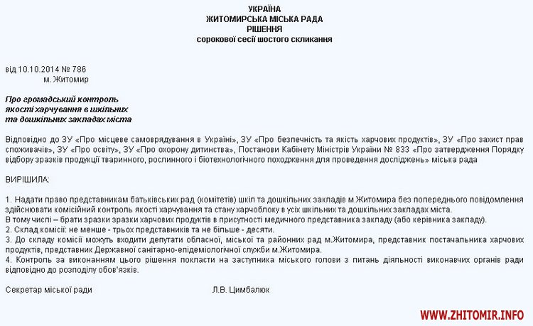 Як повідомляв Житомир.info, 10 жовтня 2014 року Житомирська міська рада надала дозвіл членам батьківських комітетів проводити перевірки якості харчування дітей у школах та дитсадках.
