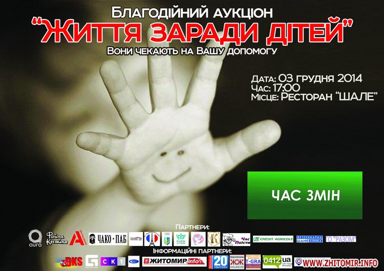 Аукціон відбудеться 3 грудня 2014 року о 17.00 годині у приміщенні ресторану «Шале». На аукціоні будуть представленні роботи художників та майстрів міста, виставленні лоти з автографами відомих діячів спорту. Всі кошти, які будуть отримані під час проведення аукціону будуть передані дітям з онкологічним захворюванням, які проживають у Житомирі.