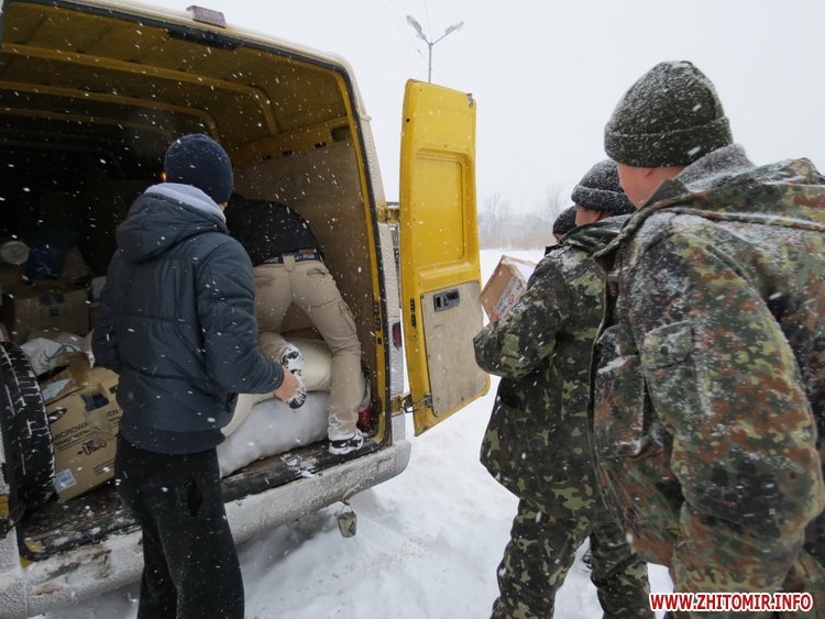 «Мы выехали в составе 7 человек в ночь с субботы на воскресенье тремя микроавтобусами, загруженными под потолок. Ездили без главного Александра (Таргонского - координатора Автомайдана-Житомир), он был в Тернополе на съезде Автомайдана. Эта поездка оказалась одной из самых сложных по погодным условиям – выехали за Коростышев, и начался снег. Всю дорогу снег не прекращался, дороги не чистятся. Было тяжело, потому приехали позже. Было много адресных посылок, пунктами назначения у нас были Краматорск, там в аэропорту выгрузили пацанам адресные посылки. Потом поехали на Артемовск, выгрузились, потом, как обычно, к нашим разведчикам из 54-й роты. Завезли ребятам цепи на бензопилы, кабель, болты, лампочки, фильтры на машины. Плюс много теплых вещей, грелки для тела, термобелье. Люди передавали связанные собственноручно носки, шарфы. В Житомире есть такая волонтер Светлана Михайловна, она помогает госпиталю и постоянно передает что-то ребятам. В этот раз они связали 6 шарфиков, на каждый она пришила сине-желтую ленточку – разрезала на кусочки ленту, с которой прошла всю революцию на Майдане. Сказала передать именно нашим и лично - Вове «Татарину», потому что она видела его по телевизору, и прибавила, что это будет их оберегать. Мне посчастливилось передать этот шарф именно Вове «Татарину».