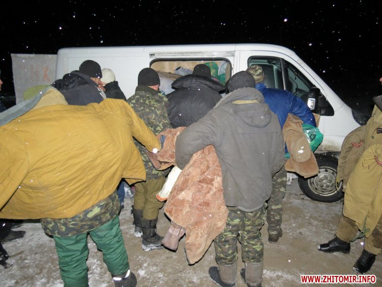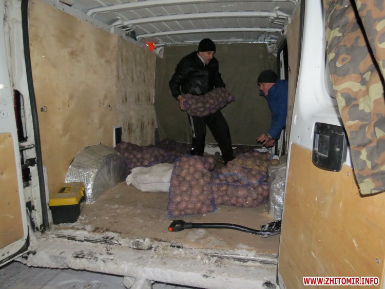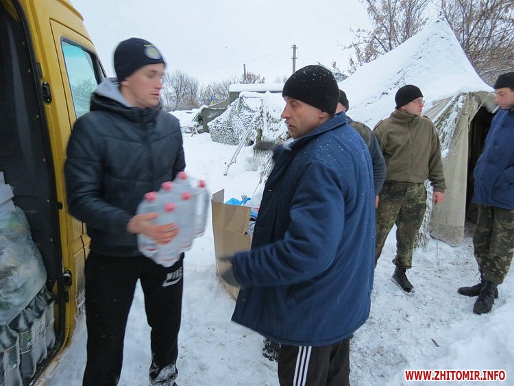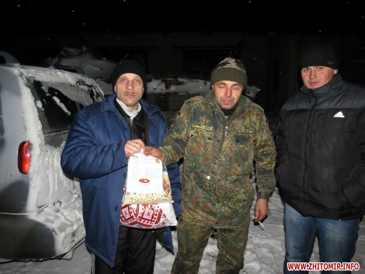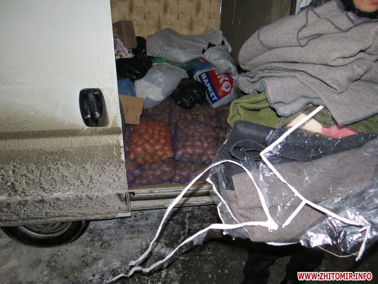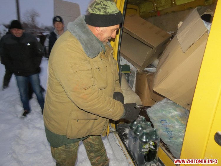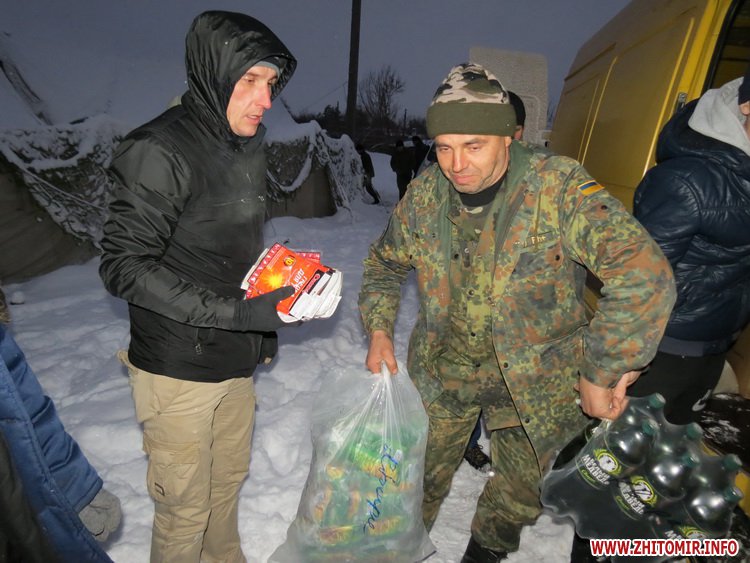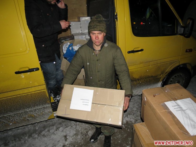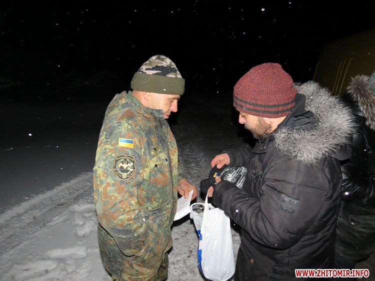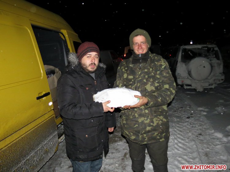 Когда выгрузились и тронулись в путь, уже смеркалось. Первый раз у нас так – немного не рассчитали, плюс погодные условия. Ребята наши изначально хотели заночевать, но если бы заночевали, вода, которую мы везли в огромном количестве, замерзла бы, как замерзла бы картошка, консервация и другие продукты. Было около минус десяти градусов. Конечным пунктом у нас был Славянск, там отдел транспортной милиции, ребята охраняют железную дорогу. Это милиционеры, откомандированные из Киева, Львова, Донецка. Они рассказали, что к ним волонтеры вообще не заезжают. Там женщины и мужчины, мы завезли сладкое, термобелье, в том числе для женщин. Потом нам надо было отдать адресные посылки, одному из разведчиков передать лично в руки тепловизор – как мы его называли «хрусталь». Хоть было темно, решили все равно ехать. Нас сопроводили до места дислокации 50-го рембата, 128-й горнопехотной бригады. Раздали адресное, потом кому что надо – кожухи, формы. Собралась целая куча пацанов, пообщаться хотели. Общение это происходило в полной темноте, так как фары нельзя включать. Мы приехали туда, нас с сопровождением привел Вова «Татарин». Потом ребята, которые там находятся, окружили нас с автоматами, ну, мол, в случае чего. Практически не освещалось ничего, выгружались в темноте. Когда выгрузились и ждали, когда соберут вещи одного из житомирских бойцов, который сейчас находится в госпитале, подъехала военная машина. Вышли военные, передернули автоматы и «Вы кто такие?». Я говорю: «Волонтеры». «Чего сюда приехали? Видите, какое время суток?». Говорю, выехали поздно, так получилось. Они сразу – сверять по номерам. Почистил номера от снега, показал номера всех машин, показали паспорта, убедились, что мы житомирские. Они говорят: поступили данные, что приехали три непонятных автобуса, надо проверить, к кому приехали, что привезли, что забираете. Полностью все уточнили, потом извинились, мол, это наша работа.