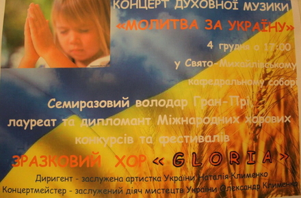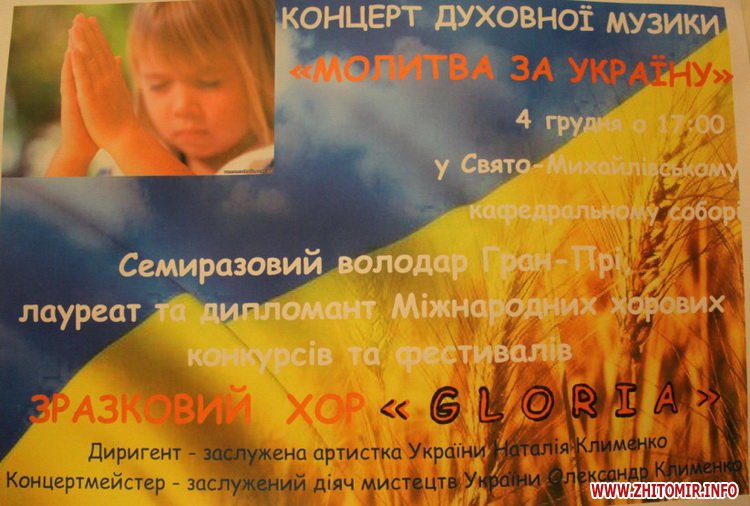 4 грудня о 17.00 у Свято-Михайлівському кафедральному соборі відбудеться концерт духовної музики «Молитва за Україну» у виконанні семиразового володаря гран-прі, лауреата та дипломанта міжнародних хорових конкурсів та фестивалів - зразкового дитячого хору «Gloria» (Житомир).