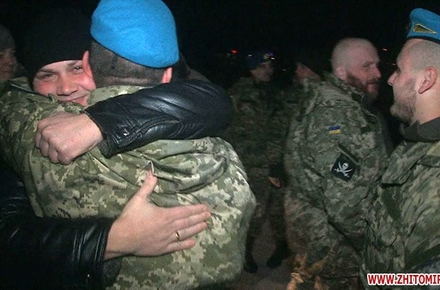 Близько 50-ти «кіборгів» 2-го батальйону 95-ї окремої аеромобільної бригади повернулися додому у відпустку. Зустрічати їх в ніч з 7 на 8 грудня до КПП на Богунії вийшли десятки житомирян.