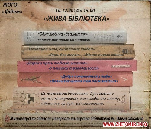 У середу, 10 грудня, о 15.00 у Житомирській обласній науковій бібліотеці ім. О. Ольжича на Новому бульварі стартує проект "Жива бібліотека", "книгами" у якій будуть цікаві та активні люди міста.