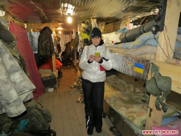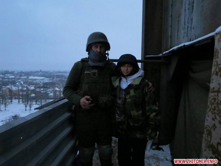Там ми заночували, а розвантаження призначили на ранок. Але, вставши зранку, ми, перш за все, з Юлею (Толмачовою) пішли на точку, туди, де корегується вогонь. Цю точку вони називають «небо»: знизу хлопці охороняють землю, а зверху небо. Це своєрідна вишка, висотою близько 32 метрів над землею. Колись там була ліфтова шахта, тобто, спускала людей вниз у шахти для видобутку вугілля. Там ми зустріли нашого Ярослава з Самооборони, який воює зараз у «Правому секторі». Він нас завів на «небо», показав усе, розказав, що до чого: як хлопці там працюють, як корегують вогонь, як охороняють. З цієї вишки видно всю округу, навіть Донецький аеропорт. Хлопці там реально герої. Мене переповнюють емоції… У «Правому секторі» воюють хлопці від 18 років і до 60. Усі добровольці. Не отримують за це жодної копійки, але воюють і захищають нашу державу, нашу землю. Кажуть: «Я на своїй землі, і я її захищаю і буду захищати до останнього».