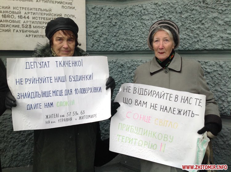 26 декабря под стенами Житомирской мэрии несколько человек протестуют против возобновления строительства многоэтажки по улице 1 Мая. Люди держат в руках плакаты с надписями: «Не отбирайте у нас то, что вам не принадлежит: солнце, свет, придомовую территорию!», «Депутат Ткаченко! Не разрушайте наши дома, найдите другое место для 10-этажки, оставьте нас в покое», «Ткаченко, вон из нашего участка!».