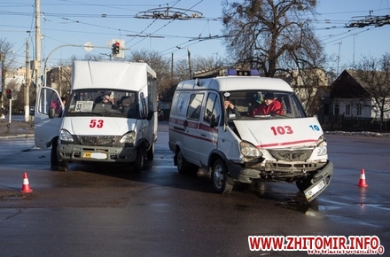 Утром 11 января в Житомире на регулируемом перекрестке машина «скорой помощи» столкнулась с маршрутным автобусом.