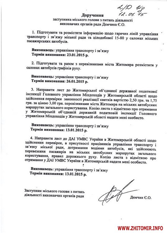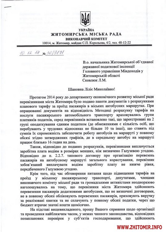 «Направить письмо в Житомирскую объединенную государственную налоговую инспекцию Главного управления Миндоходов в Житомирской области относительно осуществления проверки законности реализации билетов стоимостью 2,50 грн. и 1,75 грн. по цене 3,00 грн. перевозчиками города Житомира на городских автобусных маршрутах общего пользования», - гласит один из пунктов поручения.