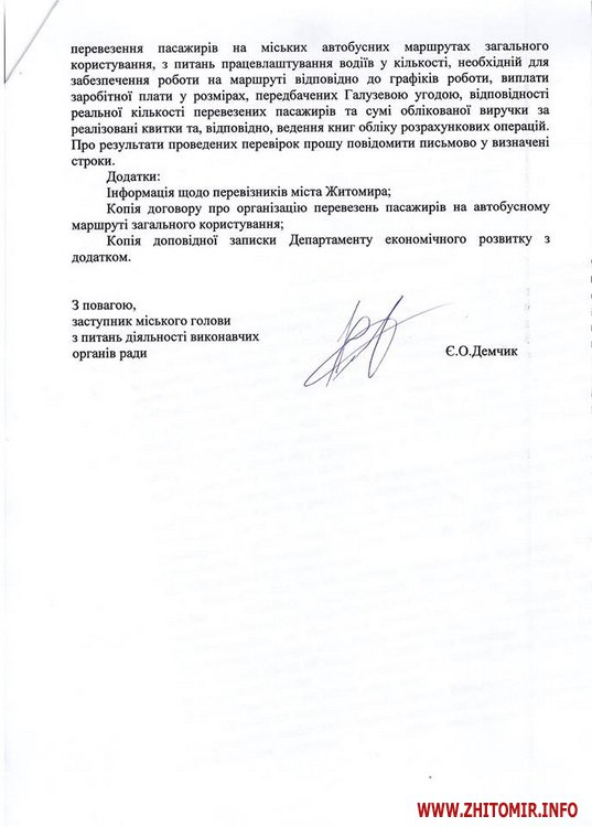 Также 10 января Евгений Демчик направил письмо руководителю Житомирской объединенной государственной налоговой инспекции с просьбой провести в ближайшее время внеплановые проверки субъектов хозяйствования, которые занимаются пассажирскими перевозками в Житомире. Заместитель мэра просит налоговиков обратить внимание на количество водителей, их зарплату, соответствие количества перевезенных пассажиров и суммы выручки за реализованные билеты.