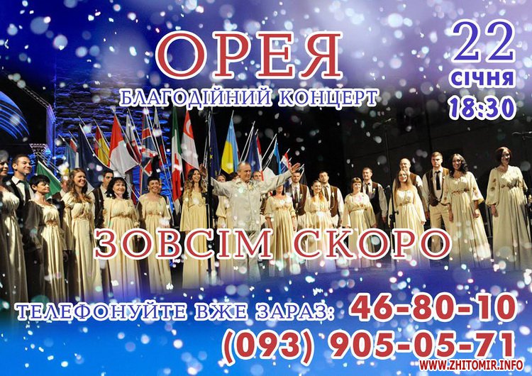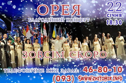 22 січня за участю академічної хорової капели «ОРЕЯ» відбудеться благодійний концерт в приміщенні Житомирського телецентру за адресою вул. Театральна, 7. Початок концерту о 18.30.