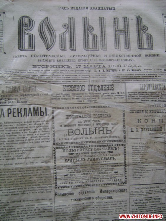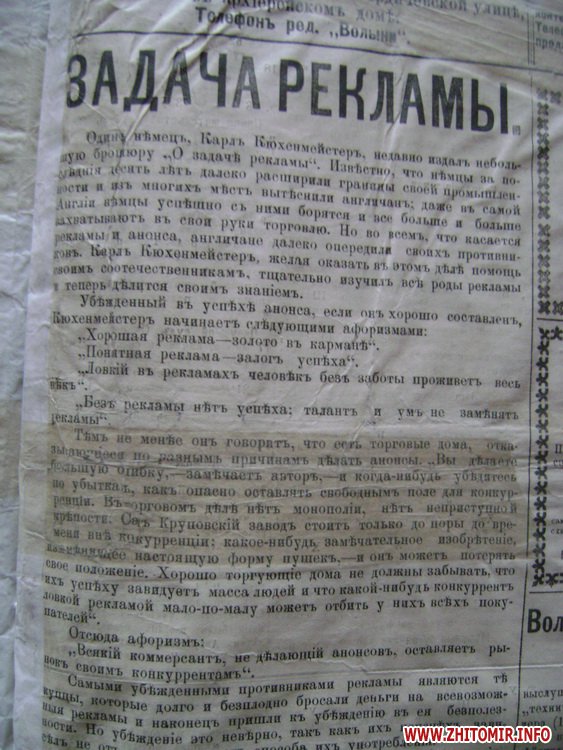 Речь пойдет о рекламе товаров и услуги в Житомире именно в XIX веке. «Громко кричать», собственно, означает перевод латинского reclamo. Поводом же нашего экскурса в историю стало желанием выяснить что и как рекламировалось в Житомире больше сотни лет тому. В итоге получилась данная публикация, которая может стать полезной представителям нынешнего бизнеса, которые, возможно, заимствуют какие-то рекламные трюки своих коллег с прошлого. Источником для подготовки статьи стала известная в царские времена газета «Волынь» за 1898 год, которая и сейчас хранится в Государственном архиве Житомирской области.