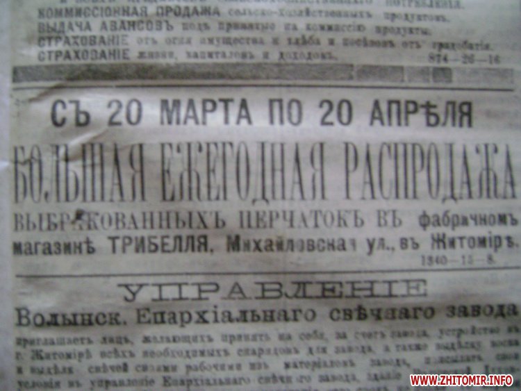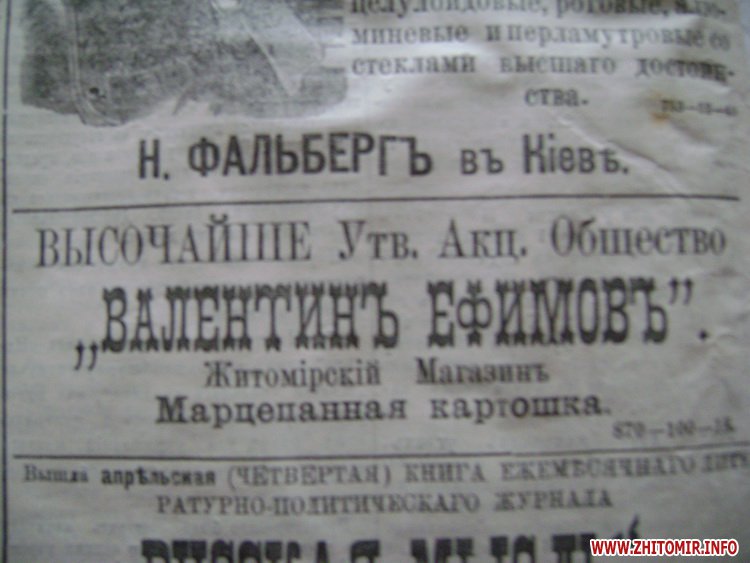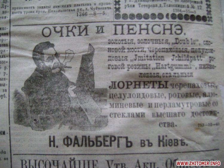 По рекламе видно, что в Житомире в те времена была довольно бойкая торговля. Культурная сфера также занимала достойное место в городской жизни: буквально в каждом номере газеты «Волынь» на первой странице размещалась реклама городского театра и Житомирского Гражданского собрания. Последняя организация проводила, видимо, интересные мероприятия по организации досуга, свидетельством чего есть хотя бы следующее объявление: «Житомирское Гражданское собрание проводит ситцевый вечер. Дамы, которые явятся на вечер не в ситцевых платьях, уплачивают по 25 копеек в пользу детского приюта императрицы Марии». Такими вечерами, скорее всего, стимулировался спрос на ситец. И в наши дни подобные, на первый взгляд, некоммерческие мероприятия, думаю, также целесообразны.