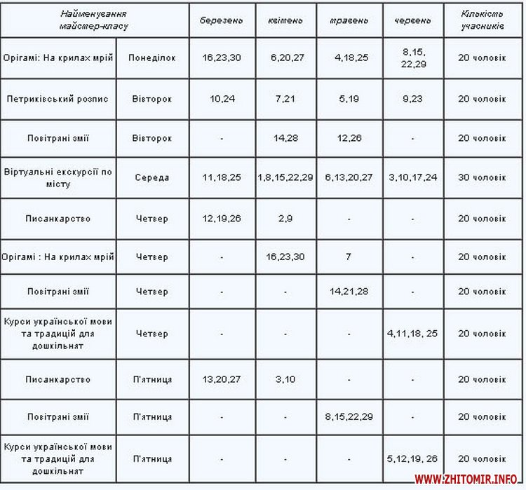 Графік проведення майстер–класів петриківського розпису, писанкарства, орігамі, курсів з української мови та традицій, віртуальних екскурсій по місту (початок занять - 16.00 год.).