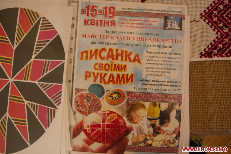 Як повідомляв Житомир.info, у Будинку урочистих подій (по вулиці Великій Бердичівській) управління культури Житомирської міської ради проводить серію безкоштовних майстер-класів з Петриківського розпису, писанкарства, орігамі тощо.