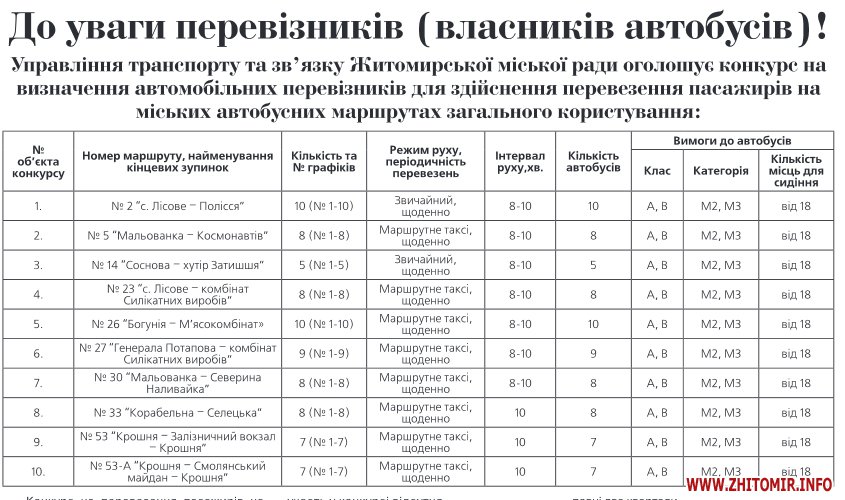 На конкурс виставлені маршрути: №2 «с.Лісове-Полісся», №5 «Мальованка-Космонавтів», №14 «Соснова-хутір Затишшя», №23 «с.Лісове-комбінат Силікатних виробів», №26 «Богунія-М’ясокомбінат», №27 «Генерала Потапова- комбінат Силікатних виробів», №30 «Мальованка-Северина Наливайка», №33 «Корабельна-Селецька», №53 «Крошня-Залізничний вокзал-Крошня», №53-А «Крошня-Смолянський майдан-Крошня». На дев’яти маршрутах автобуси будуть працювати у режимі «маршрутне таксі», на маршруті №2 – у звичайному режимі.