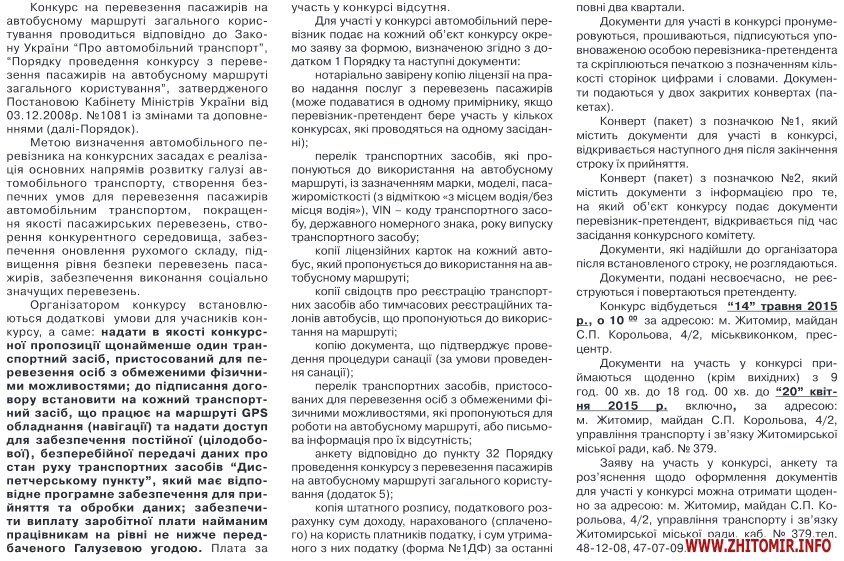 14 травня відбудеться конкурс на визначення перевізників по десяти автобусних маршрутах у Житомирі.