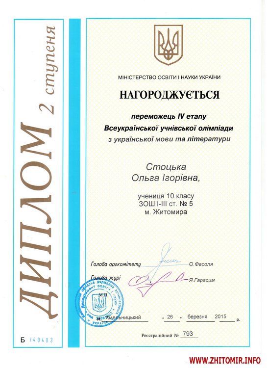 Учениця 10 класу Житомирської загальноосвітньої школи І – ІІІ ступенів №5 Ольга Стоцька стала призером ХХІХ Всеукраїнської учнівської олімпіади з української мови та літератури, яка відбулася в місті Хмельницький з 23 по 26 березня 2015 року.