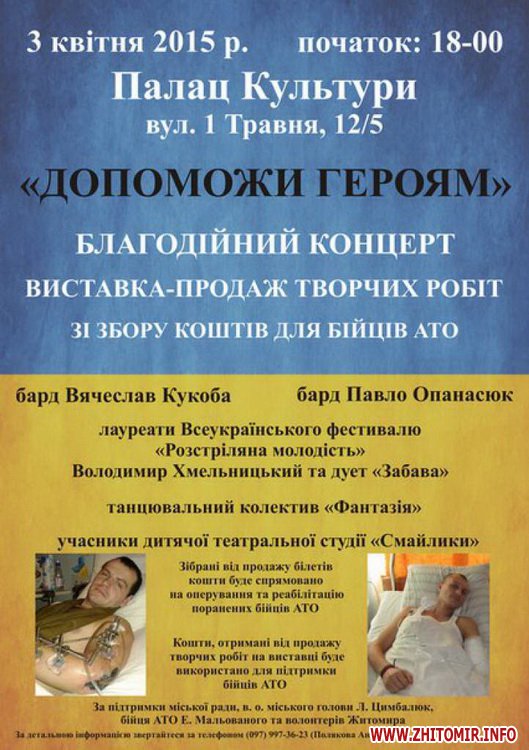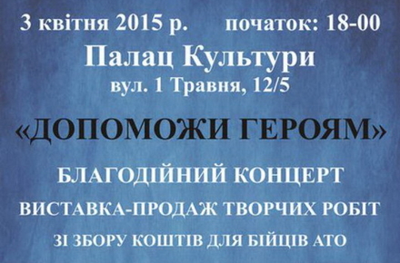 «3 квітня 2015 року о 18.00 год. у Палаці культури (вул.1 Травня, 12/5) відбудеться благодійний концерт «Допоможи героям». У концертній програмі виступи барда В’ячеслава Кукоби, барда Павла Опанасюка, лауреатів Всеукраїнського фестивалю «Розстріляна молодість» Володимира Хмельницького та дуету «Забава», танцювального колективу «Фантазія», учасників дитячої театральної студії «Смайлики», - йдеться у повідомленні.