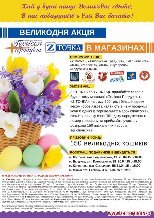 З нагоди свята в мережі магазинів «Полісся-Продукт» та «Z ТОЧКА», за участі партнерів ТМ «Житомирські ласощі»*, ТМ «Молокія», ТМ «Білоруські традиції», ТМ «Чернігівське», ТМ «Тарутіно», ТМ «Суперово», ТМ «Z VODKA», проходить Великодня Акція.