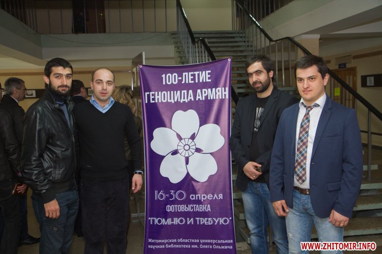 16 квітня у виставковій залі Житомирської обласної бібліотеки ім. Олега Ольжича відкрили фотовиставку «ПАМЯТАЮ І ВИМАГАЮ», присвячену 100-річчю Геноциду вірмен в Османській імперії, жертвами якого стали близько 2 мільйонів чоловік.