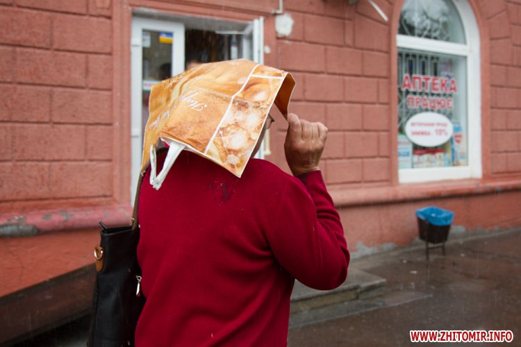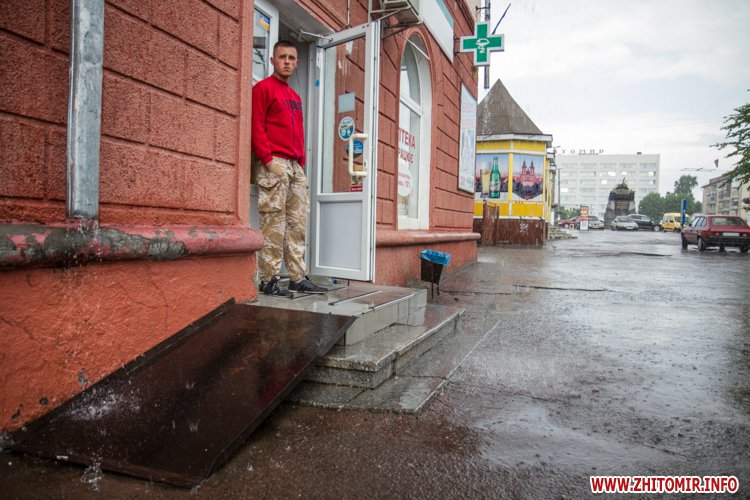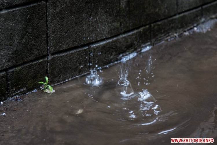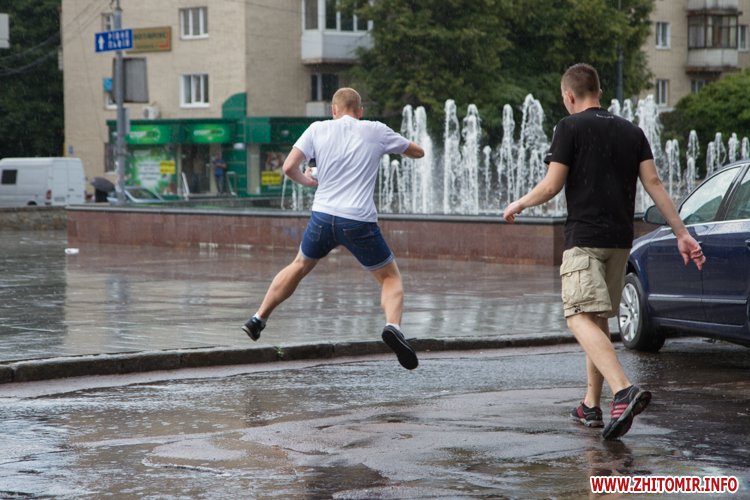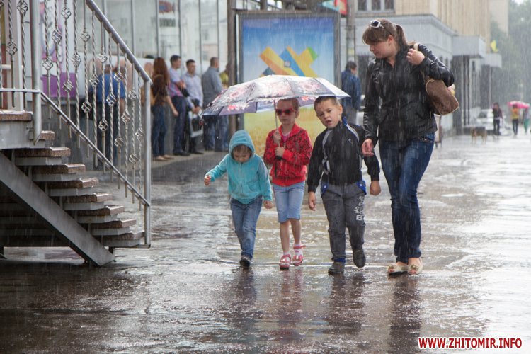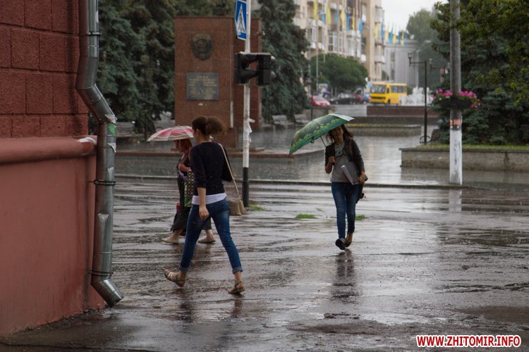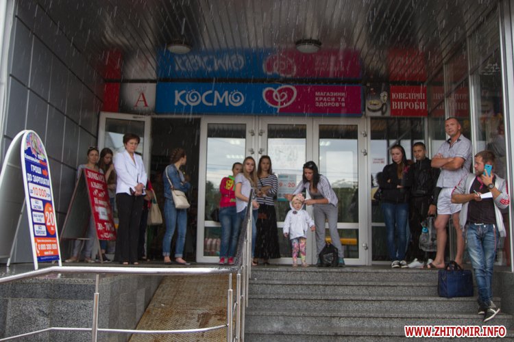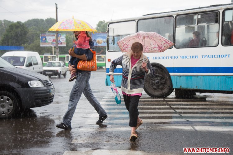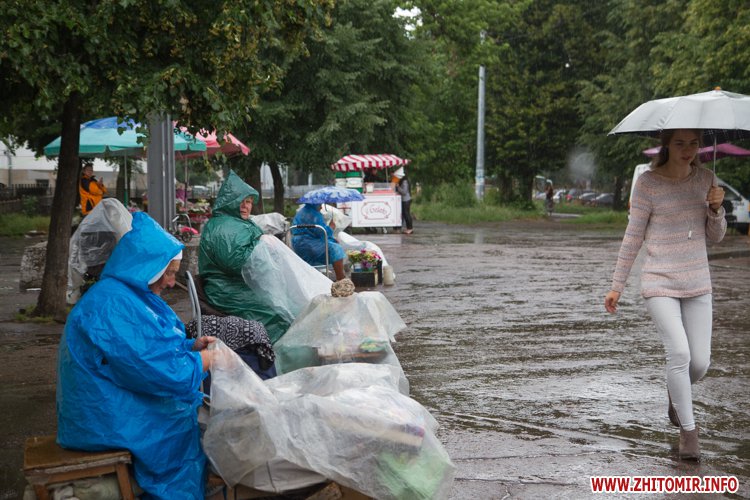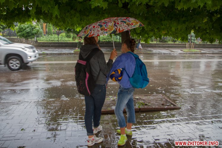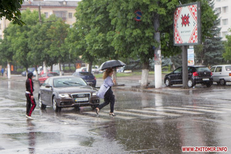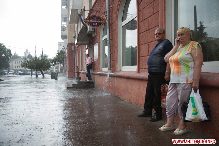 Вдень 22 червня Житомиром пронісся рясний дощ. Раптова злива багатьох застала зненацька, тож городянам, які не мали з собою парасольок, нічого не залишалось, як шукати накриття поблизу магазинів та у під’їздах житлових будинків.