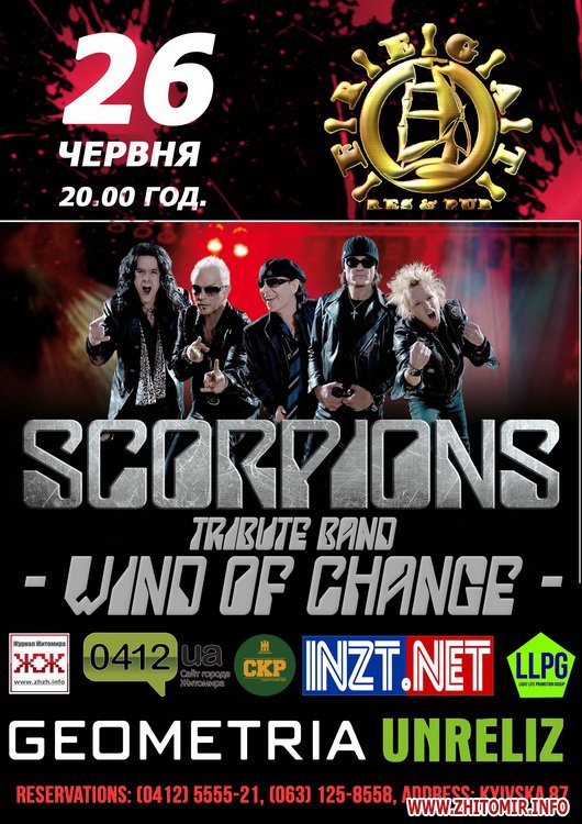 Шановні пані та панове! Паб «Фрегат» радий запросити вас на унікальний захід, концерт Scorpions Tribute Band «Wind Of Change», який відбудеться 26 червня о 20.00 год.