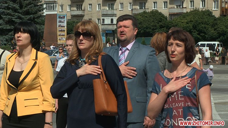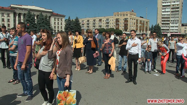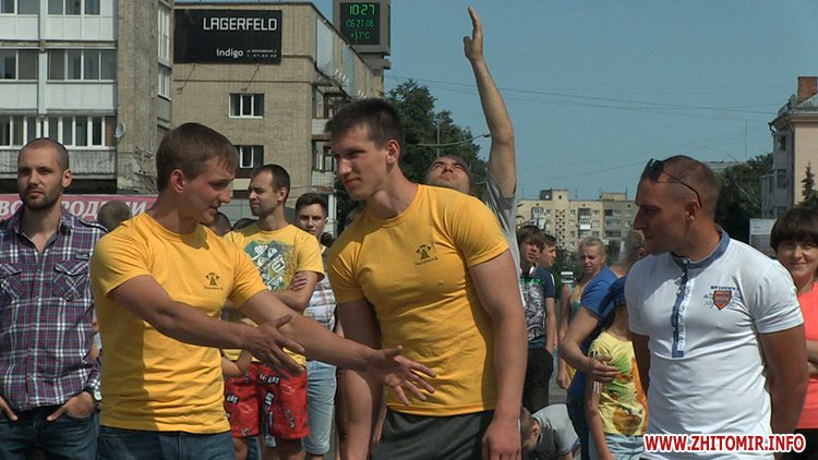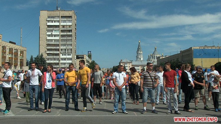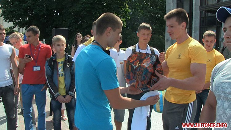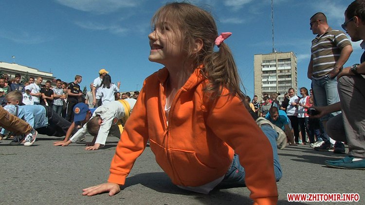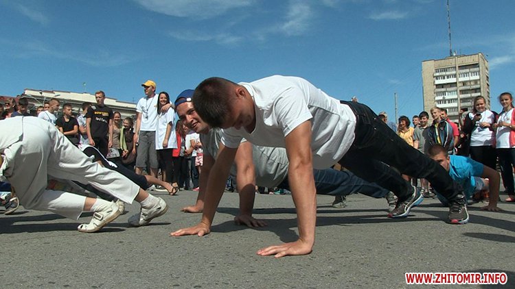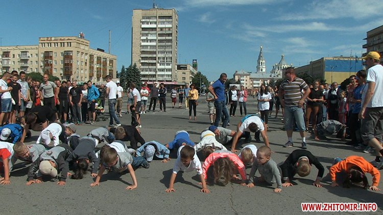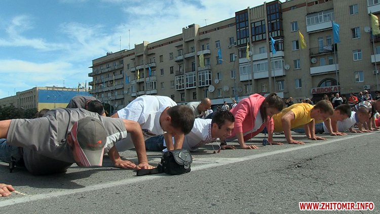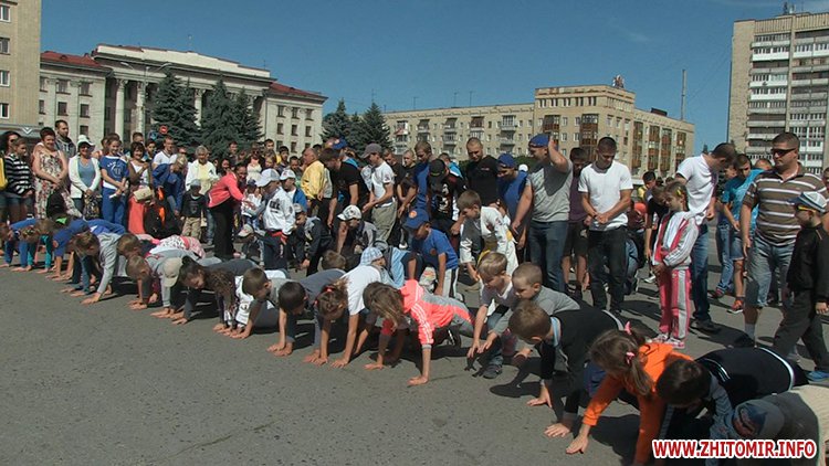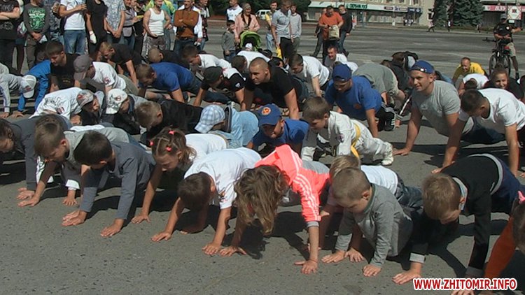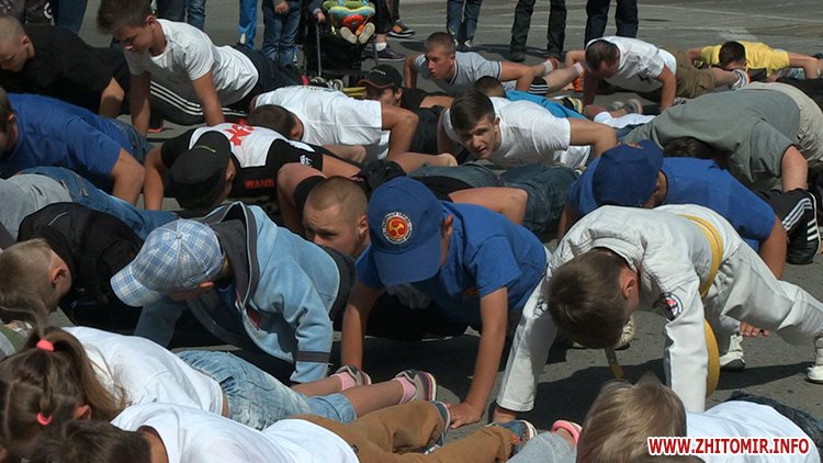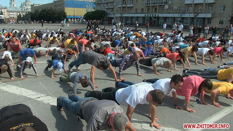 Кілька сотень житомирян зібрались зранку на майдані Соборному в День молоді, 27 червня, щоб встановити рекорд України з наймасовішого віджимання. Перед безпосередньо встановленням рекорду організатори розіграли між учасниками призи від спонсорів за найбільшу кількість віджимань.